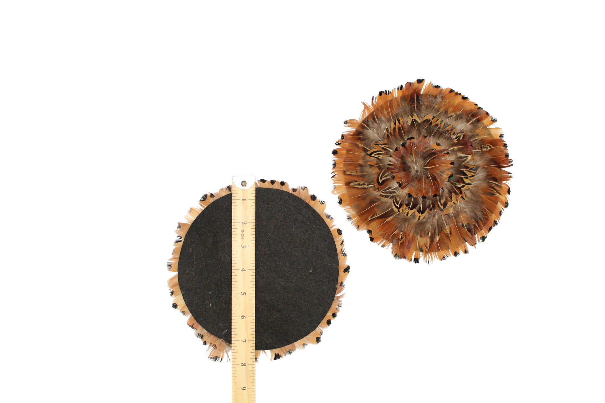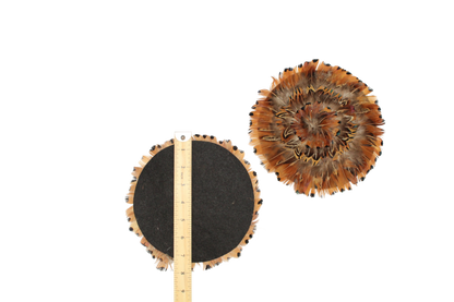 Natural pheasant pad measuring 7", ideal for adding rustic charm to hats, costumes, or crafts. Lightweight and versatile for creative designs. Sold as a single piece.