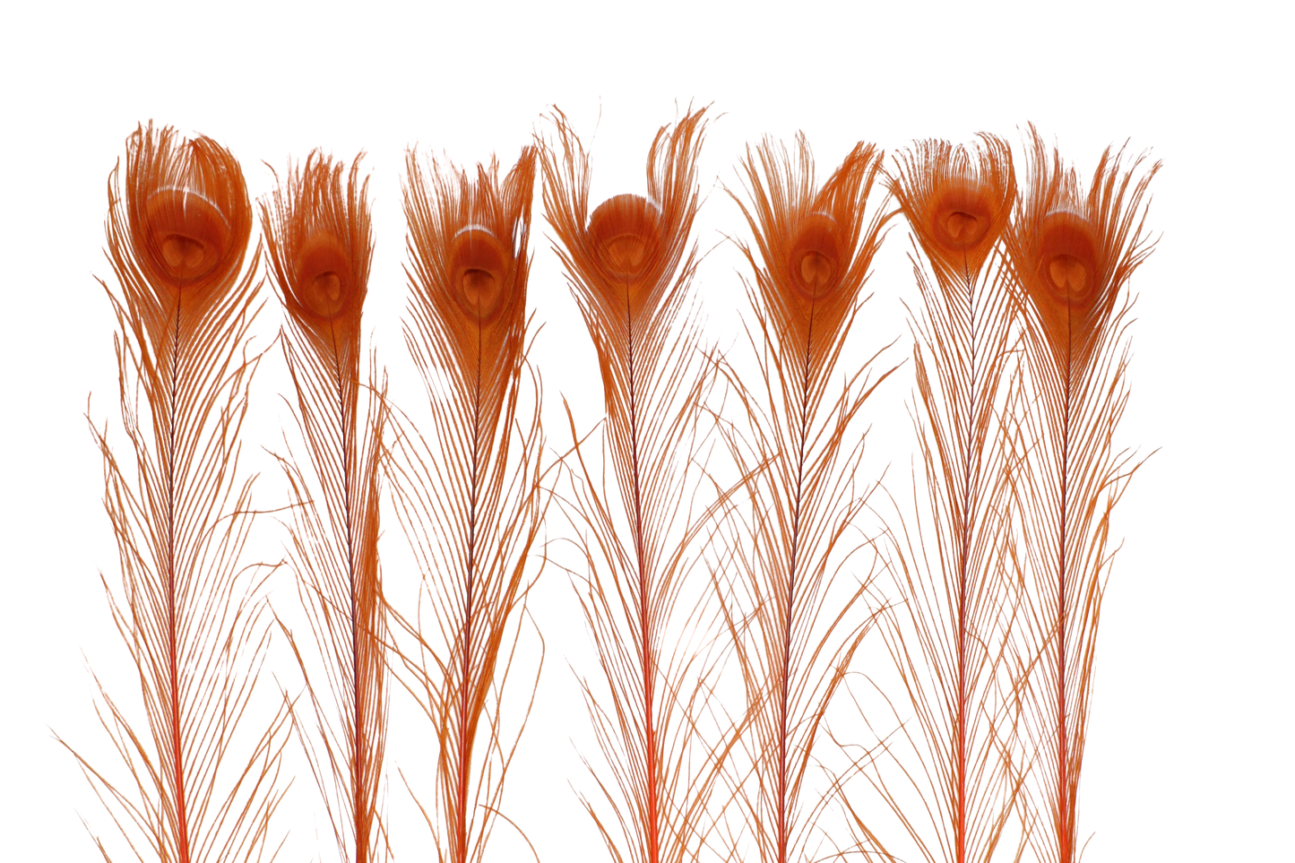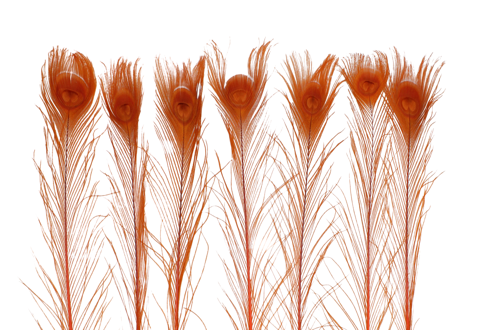 These 25-inch and up bleached and dyed peacock feathers in Orange (H62) feature a vivid, bold orange stem, with the eye perfectly matching the same bright orange hue. The bleached and dyed process creates a cohesive, powerful color statement. These feathers are ideal for festive events, autumn décor, or lively craft projects.