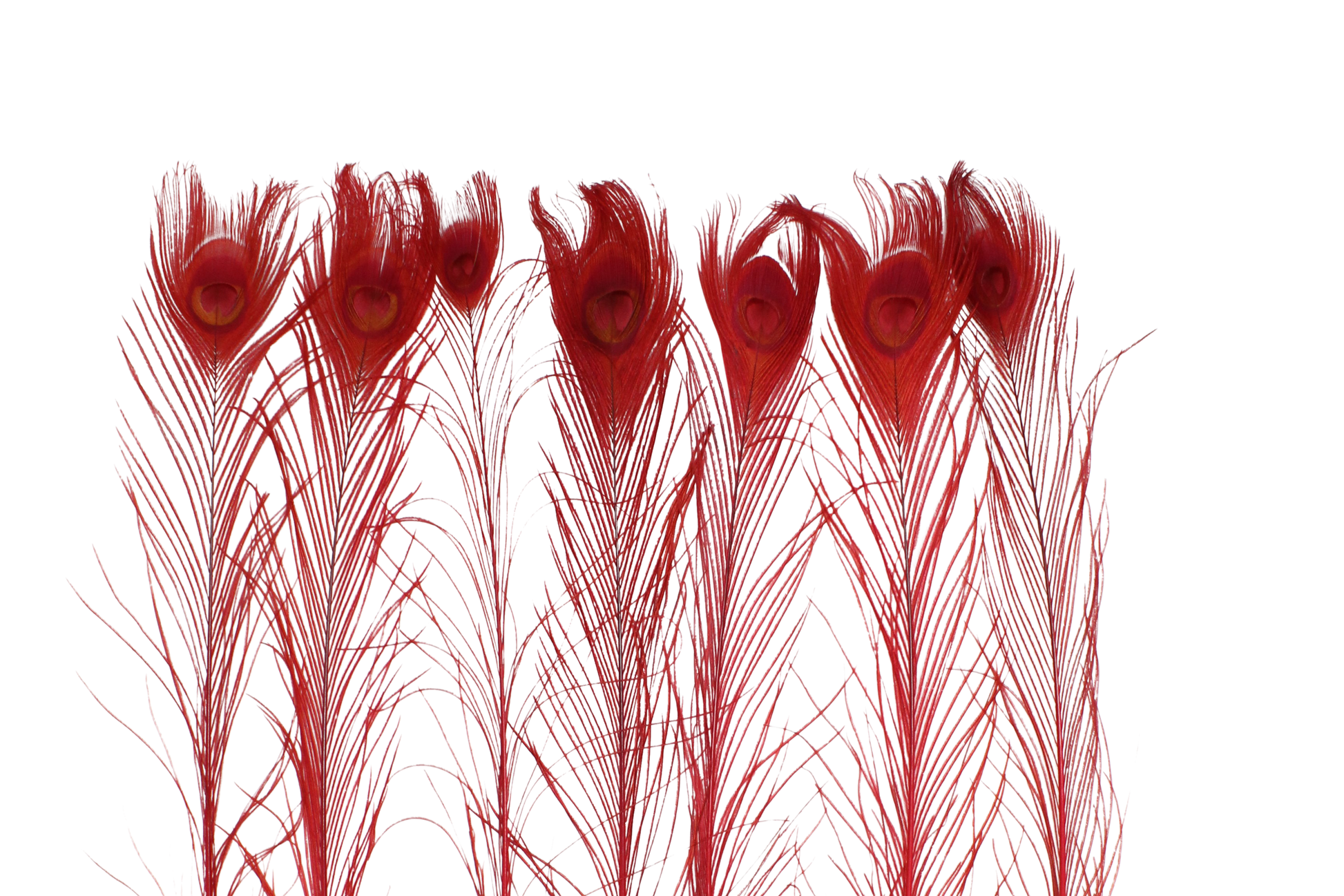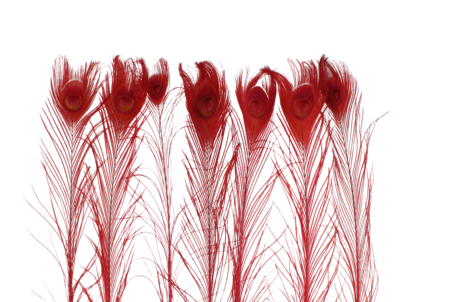 These 25-inch and up bleached and dyed peacock feathers in Red (H72) feature a bold, rich red stem, with the eye blending seamlessly in the same passionate hue. The bleached and dyed process ensures a consistent, dramatic color effect, ideal for festive décor, bold fashion statements, or striking craft accents.