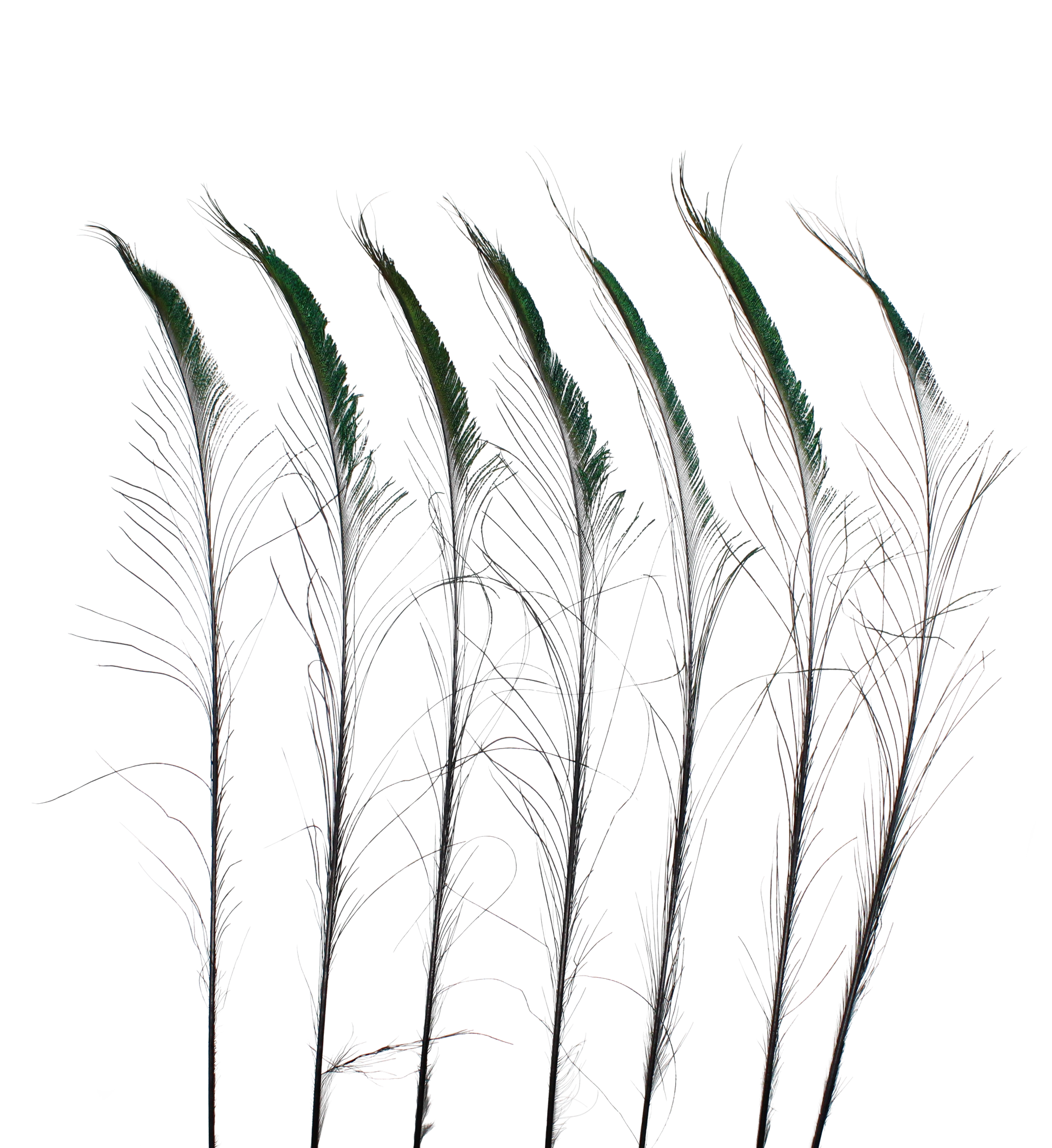 These 25-inch and up peacock swords in Black (H80) are overdyed, with the stems showcasing a rich, bold black color while the natural iridescent eye remains visible through the dye. This creates a stunning contrast of dark tones and the organic shimmer of the peacock feathers. Perfect for weddings, gothic-themed décor, elegant event décor, or dramatic craft projects, these peacock swords add a sophisticated, striking touch to any design.