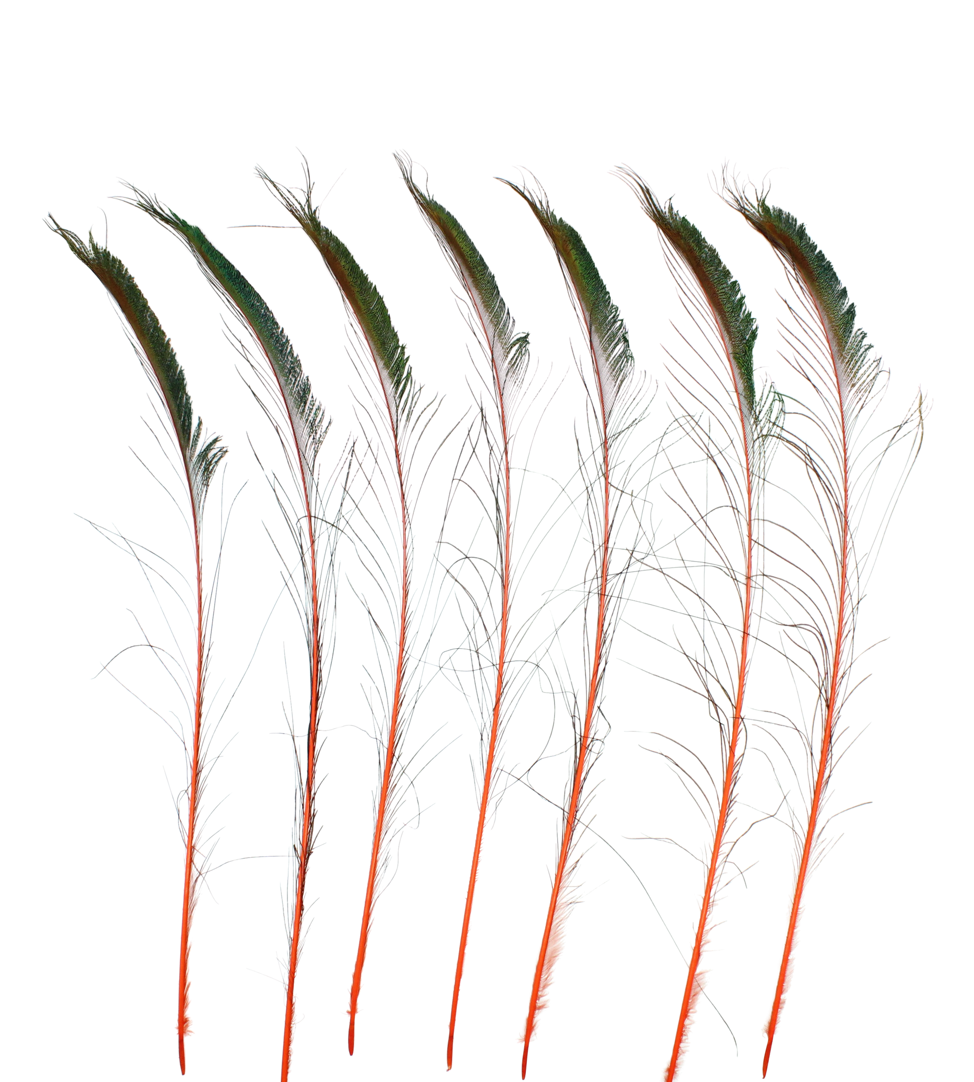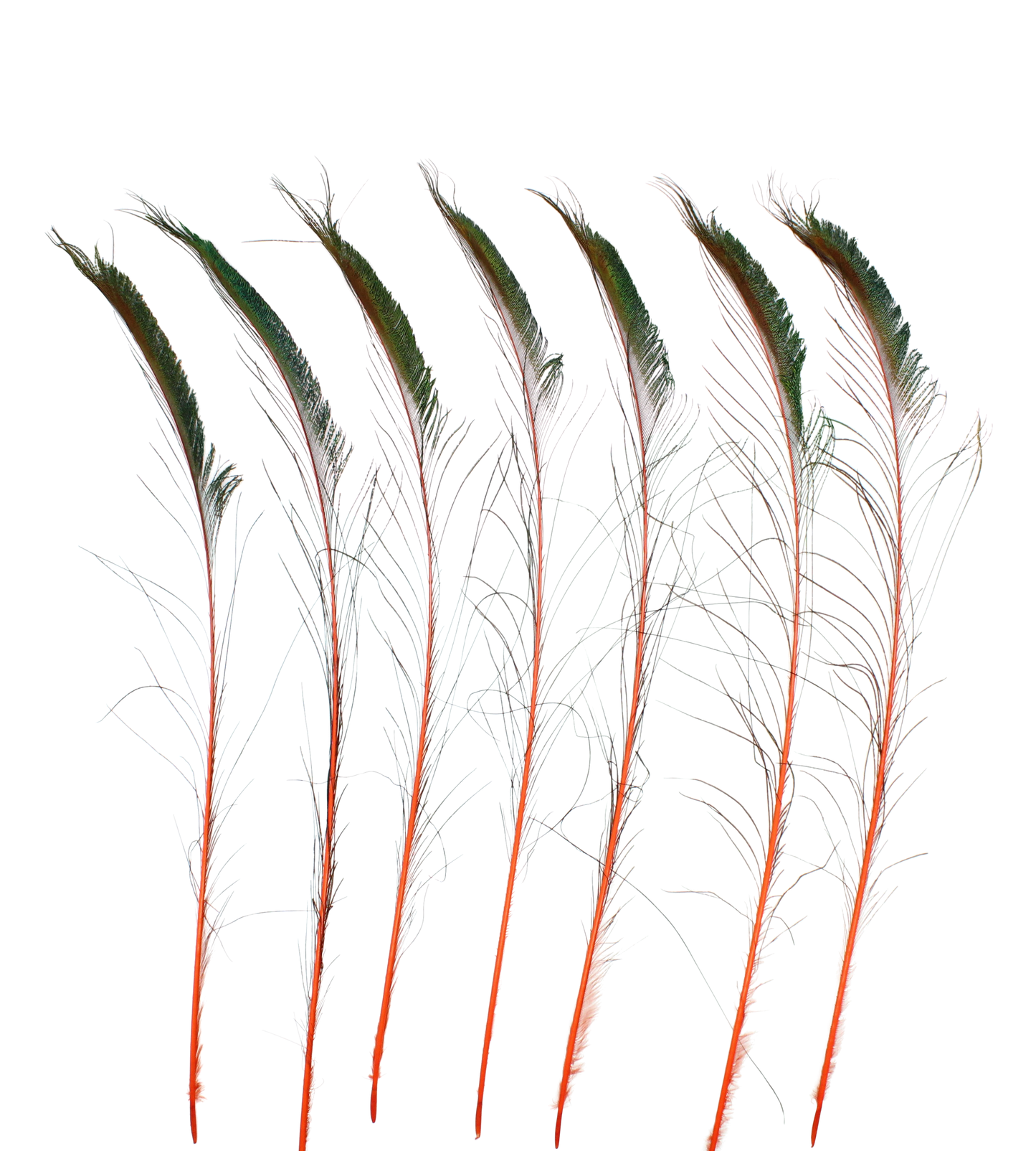 These 25-inch and up peacock swords in Orange (H62) are overdyed, with the stems showcasing a vibrant, bold orange color while the natural iridescent eye remains visible through the dye. This creates a striking contrast of fiery orange hues and the organic shimmer of the peacock feathers. Perfect for autumn-themed décor, weddings, floral arrangements, or energetic craft projects, these peacock swords add a lively, eye-catching touch to any design.