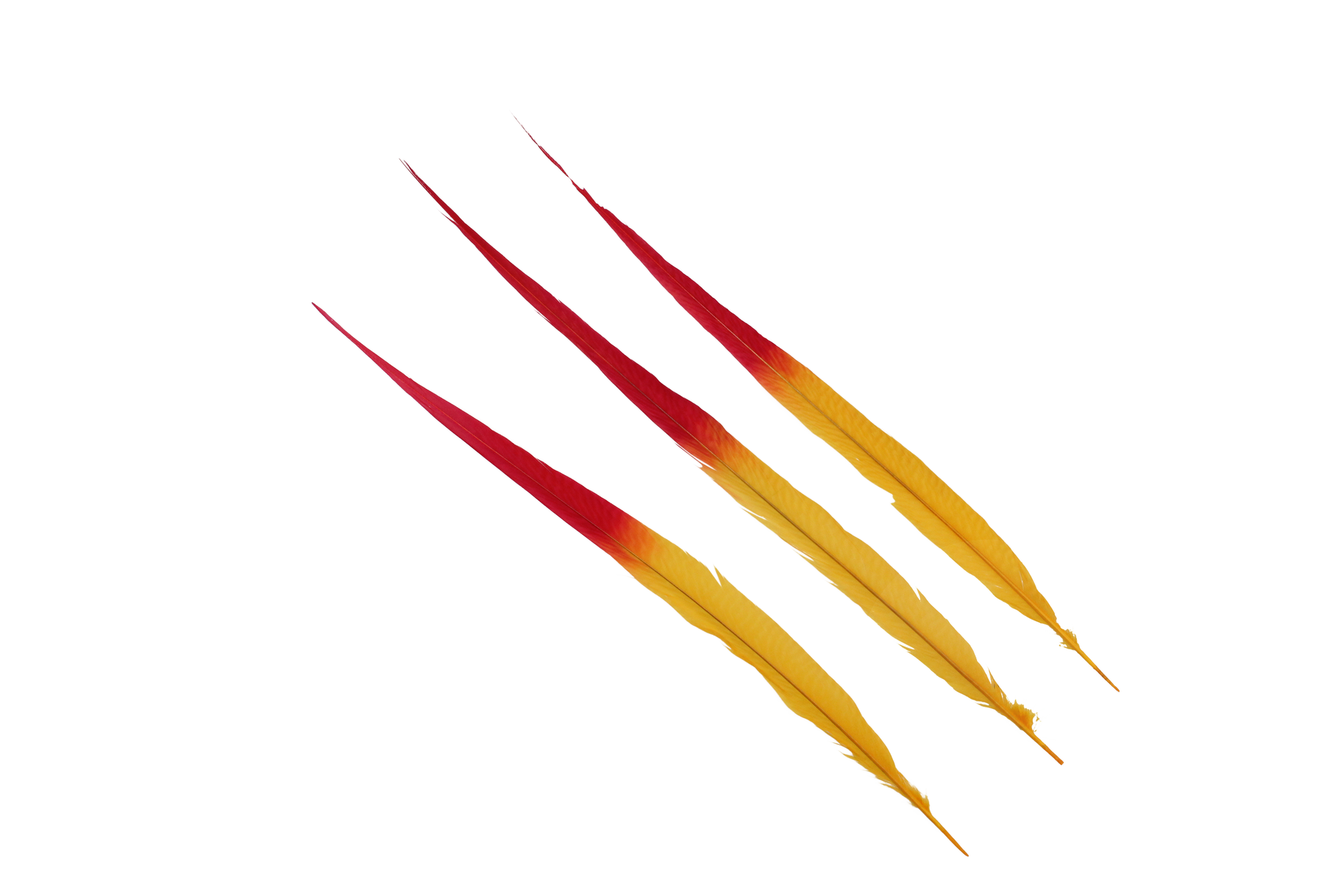 Luxurious and radiant, these 2 Tone Pheasant Goldentail feathers in Red (H72) and Gold (H38) add a touch of elegance and festive brilliance to décor, crafts, and statement pieces.