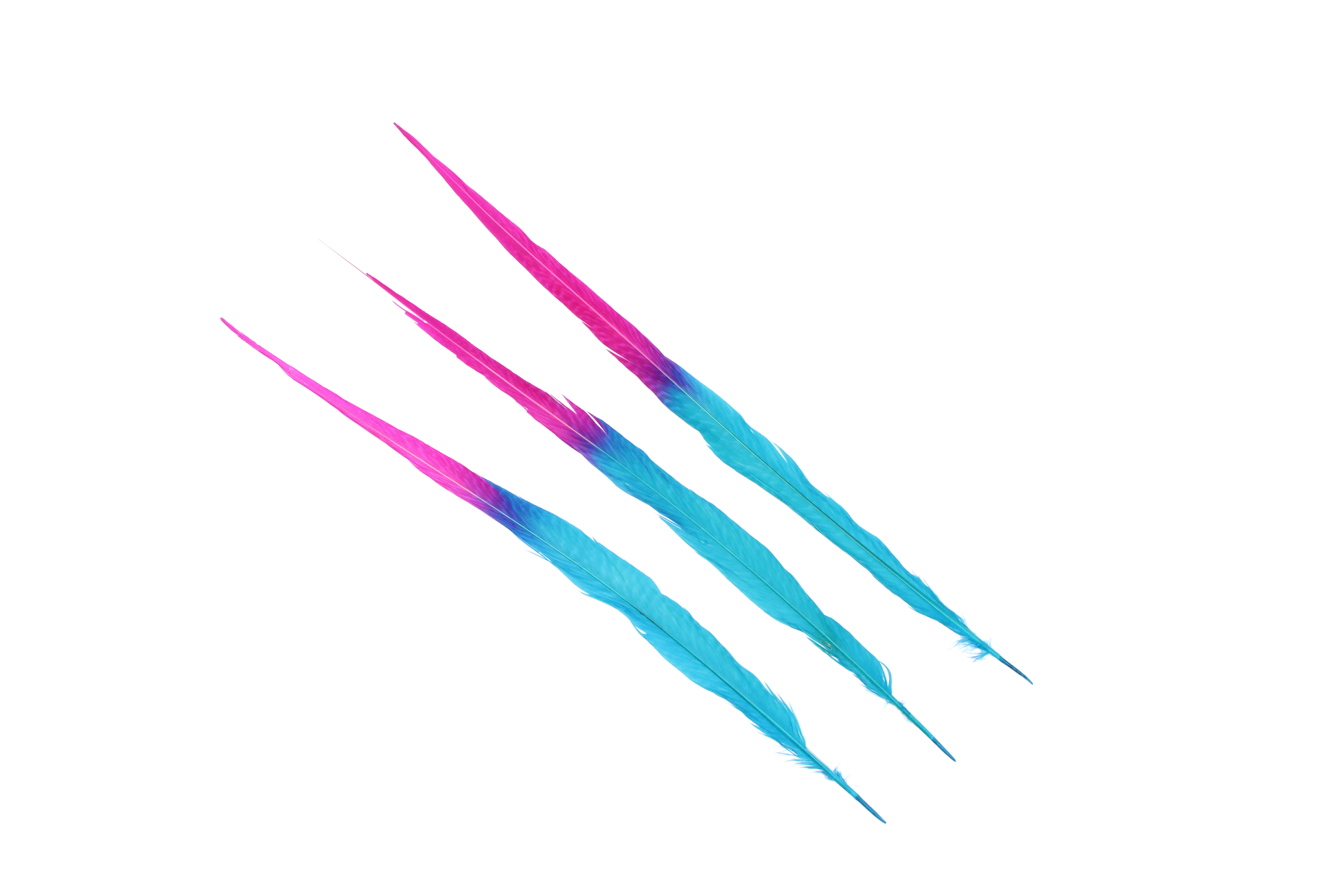 Bold and striking, these 2 Tone Pheasant Goldentail feathers in Hot Pink (H69) and Aqua (H13) make an unforgettable statement in fashion accents, décor, and standout crafts.