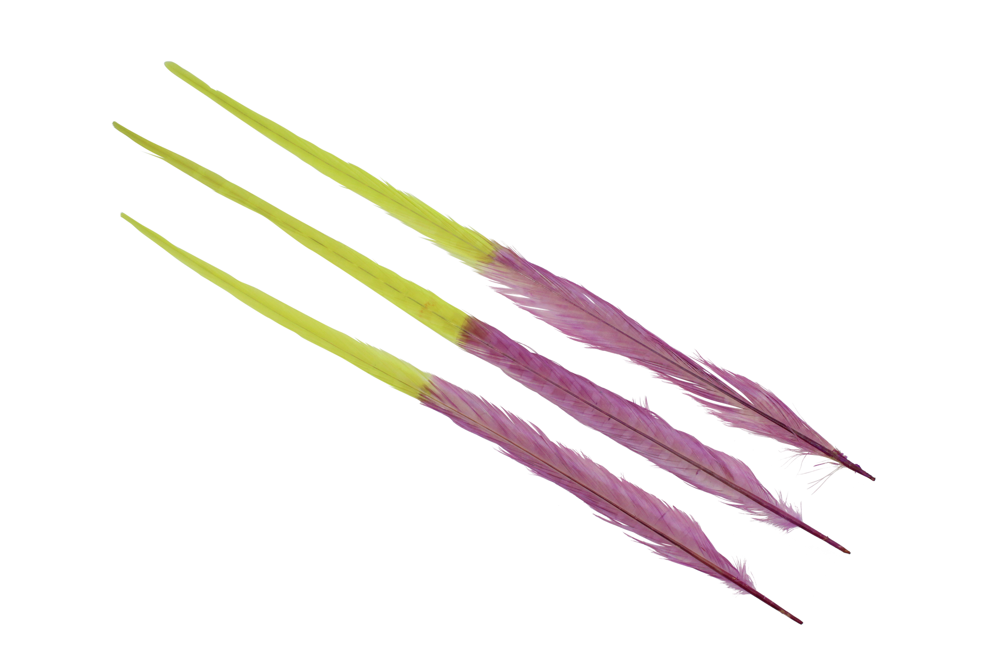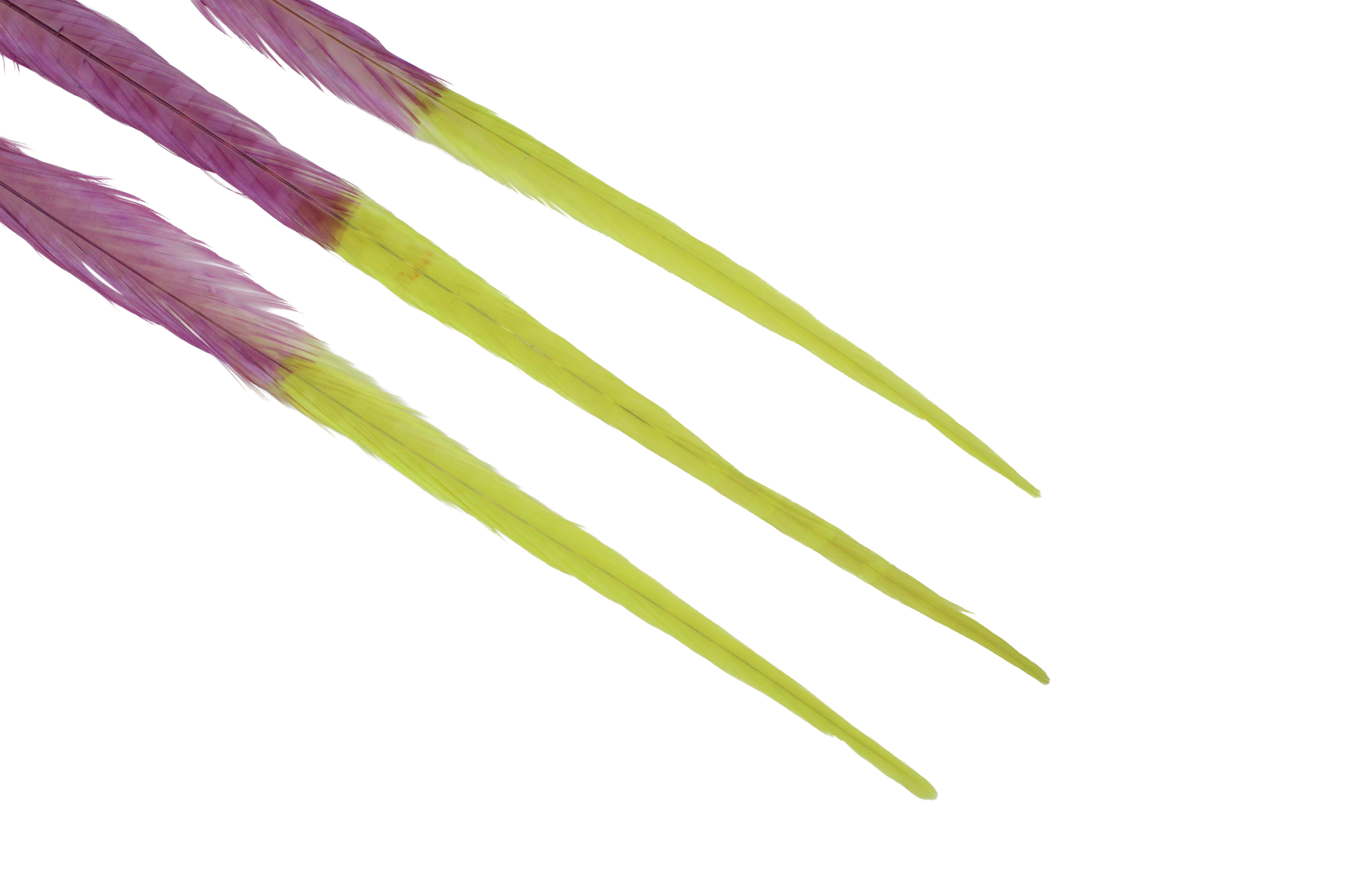 Fresh green and soft lilac combine beautifully in these Pheasant Ringneck 2 Tone H7 Apple & H74 Lilac feathers, perfect for spring-themed designs and charming crafts.